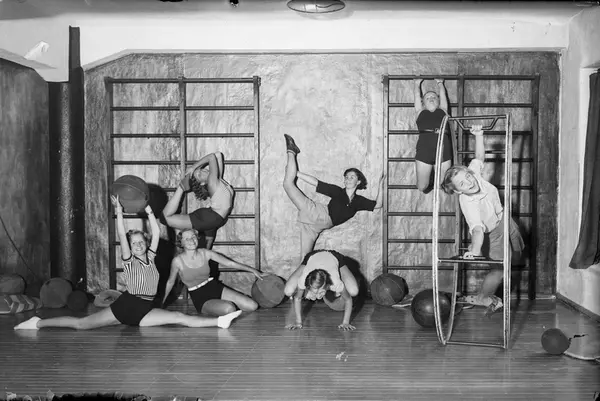 gymnastikklokale, gymnastikkundervisning, kvinner, ribbevegg, baller, gymnastikkhjul