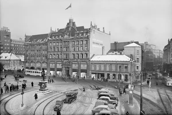 torg, forretningsgårder, Christiania Glasmagasin, portrettstatue, trikk, biler, busser, mennesker, gateliv