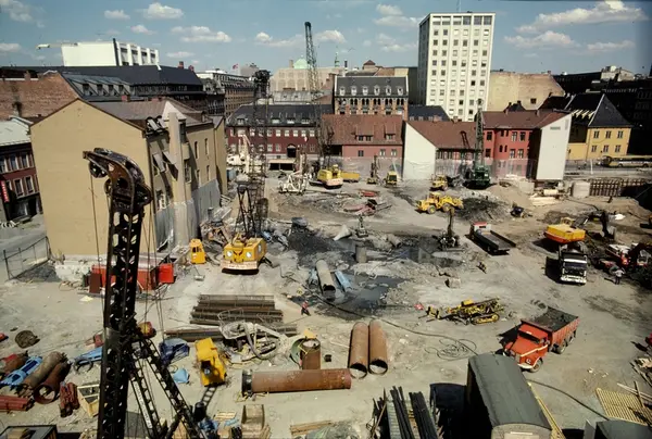 byggetomt for Norges Bank III, anleggsmaskiner, gravemaskiner, kraner, lastebil, bygårder, kontorbygninger