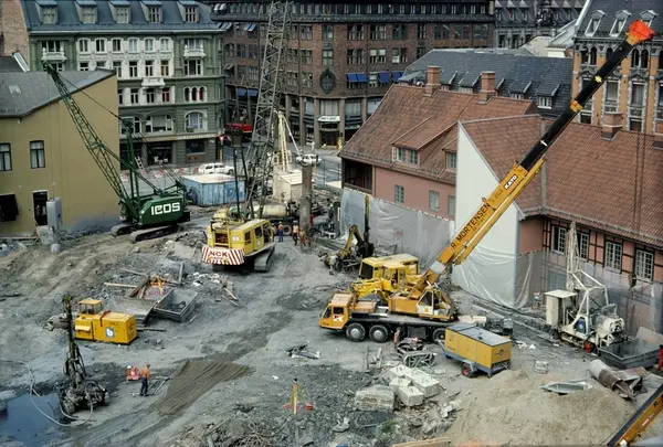 byggetomt for Norges Bank III, anleggsmaskiner, kraner, bygårder, kontorbygninger