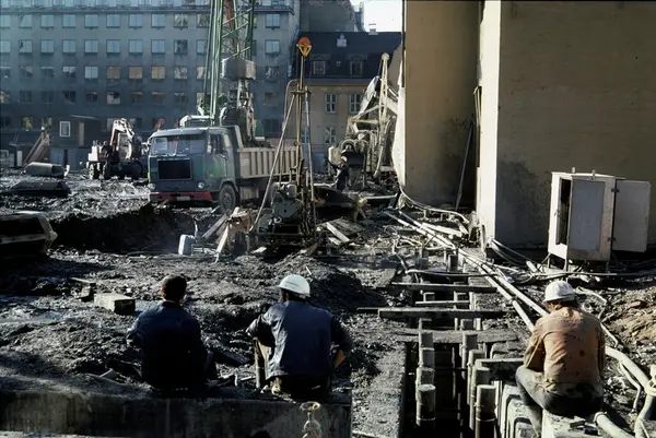 byggetomt for Norges Bank III, menn, anleggsarbeidere, anleggsmaskiner, gravemaskin, kran, Volvo F88 lastebil, bygårder, kontorbygning