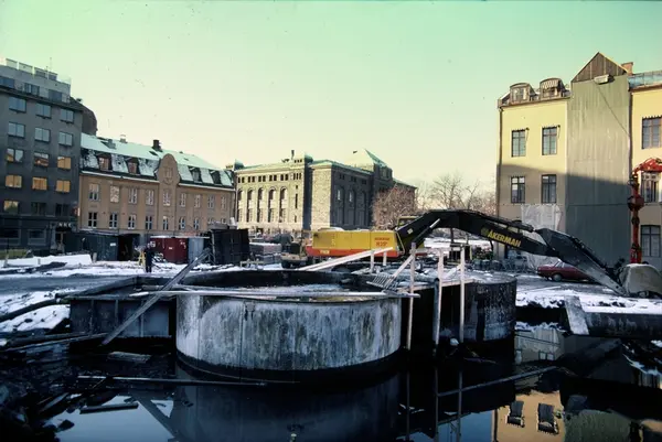 byggetomt for Norges Bank III, Åkerman H25 gravemaskin, kontorbygninger, Norges Bank II, menn