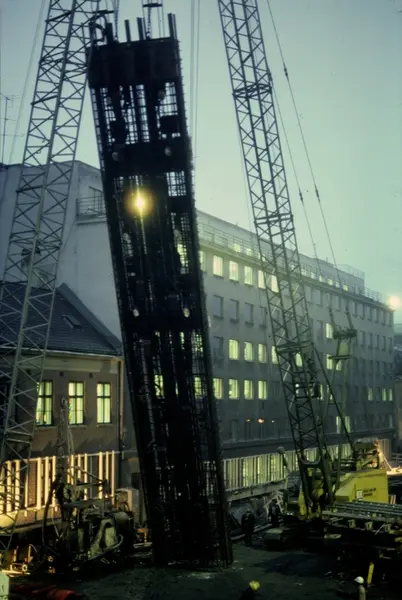byggetomt for Norges Bank III, menn, anleggsarbeidere, anleggsmaskiner, kraner, kontorbygninger
