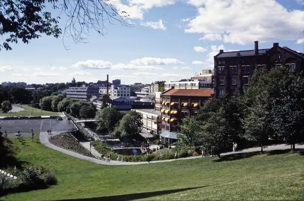 park, gangvei, mennesker, parkeringsanlegg, elv, broer, fabrikkbygninger