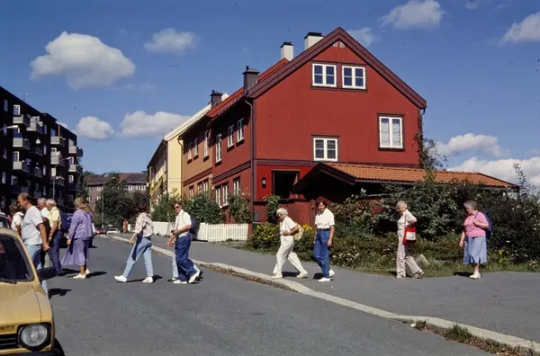 gate, mennesker, byvandring, trehusbebyggelse, boligblokk