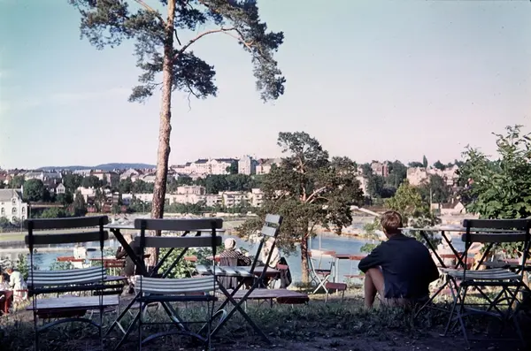 Rodeløkken kafé, friluftsrestaurant, småbord, gjester, utsikt, fjord, bebyggelse