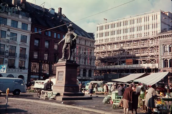 torg, boder, mennesker, torghandel, portrettstatue, biler, forretningsgårder, byggevirksomhet, stillas