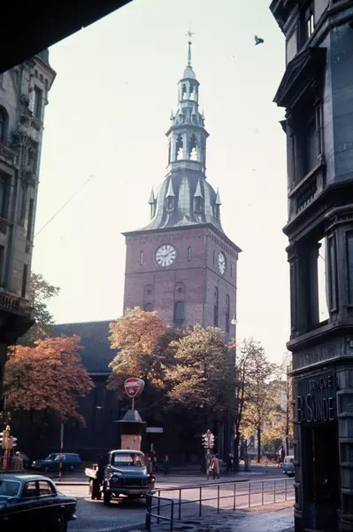 Oslo Domkirke, gatekryss, forretningsgårder, biler, mennesker