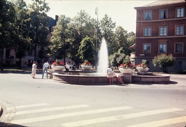 plass, fontene, blomsterkrukker, mennesker, bygårder