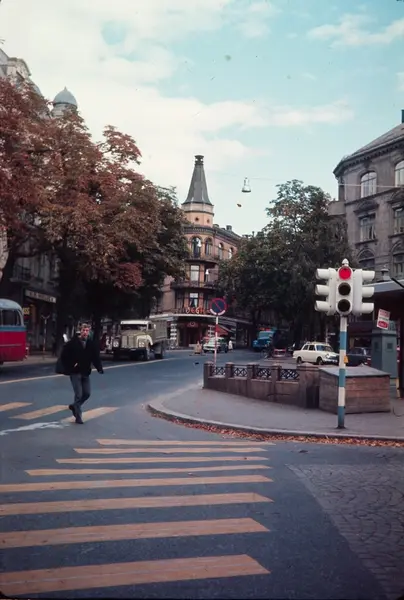 gatekryss, plass, trafikklys, fotgjengerovergang, mann, nedgang til offentlig toalett, biler, bygårder