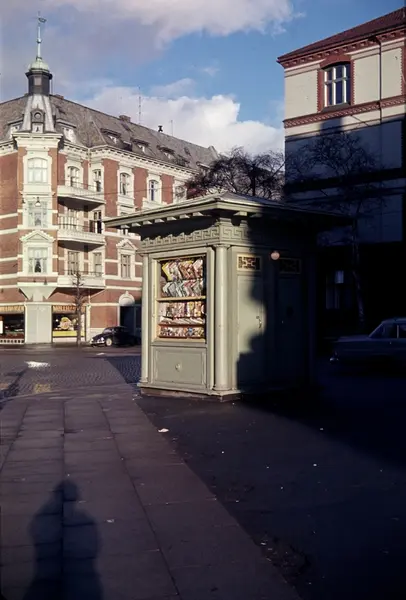 plass, kiosk, bygård, Møllhausen bakeriutsalg, Elisenberg skole, biler