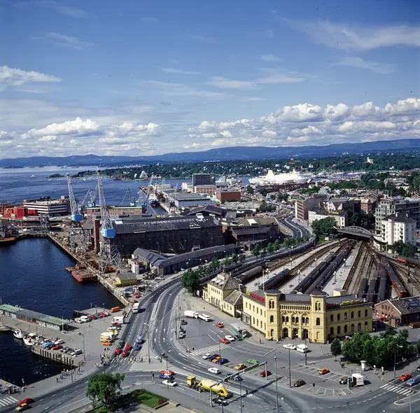 utsikt, veier, biler, Vestbanestasjonen, sporområde, Akers mek. Verksted., kraner, bygårder, kontorbyfninger, fjord, skip
