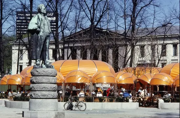 Paviljongen friluftsrestaurant, mennesker, portrettstatue, Universitetet, SAS Hotel Scandinavia