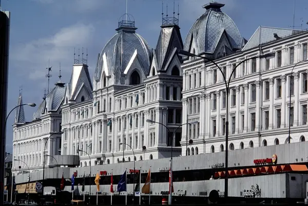 Vikaterrassen, forretninger, Victoria terrasse, kontorbygning, reklameflagg, gatebelysning, Cheese Inn restaurant
