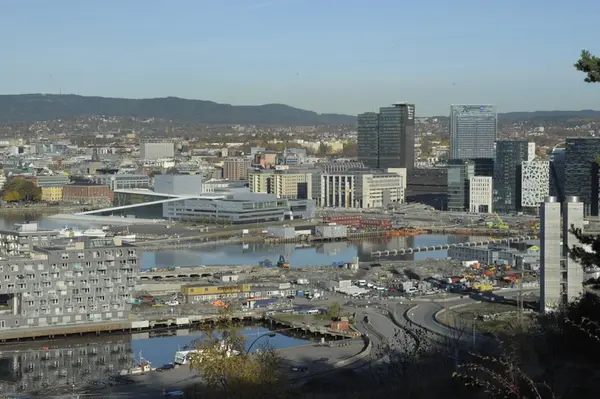 Utsikt fra Ekeberg, havn, fjord, panorama, Bjørvika, Barcode, graving, Operaen, øyer, ferge