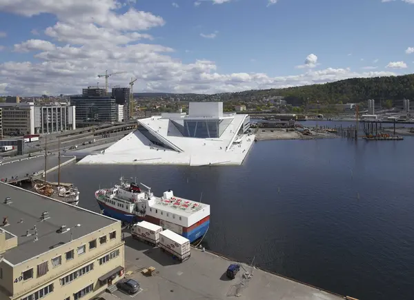 utsikt, havn, Den norske Opera og ballett, kontorbygninger, teaterbåten Innvik