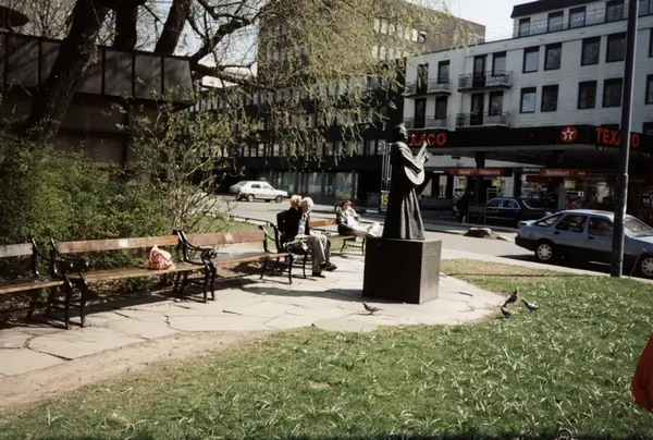 park, portrettstatue, benker, mennesker, kontorbygninger, Texaco bensinstasjon