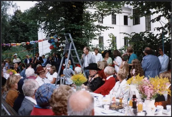 Feiring av 10-årsjubileet for den første reguleringsplanen for Homansbyen, som ble vedtatt i 1978. Feiring i regi av Homansbyen Vel (opprettet 1985). Konservator Per-Erling Johnsen fra Oslo Bymuseum med mikrofon.