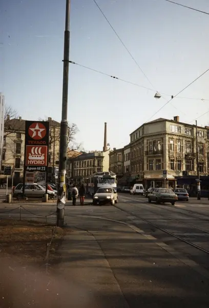 gatekryss, biler, trikk, Hydro Texaco bensinstasjon, bygårder