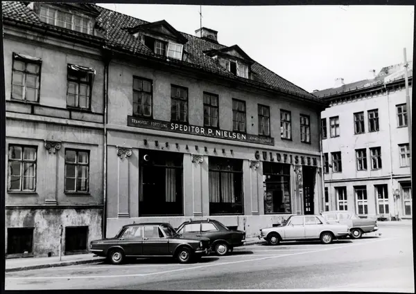 bygårder, Restaurant Guldfisken, Kvinnehuset, Speditør P. Nielsen, biler