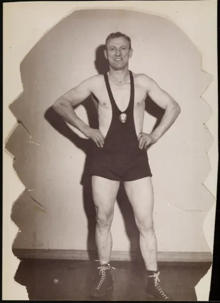 Trygve Andersen, som senere tok navnet Byman, i brytedrakt. Reprofoto av utklipt bilde.