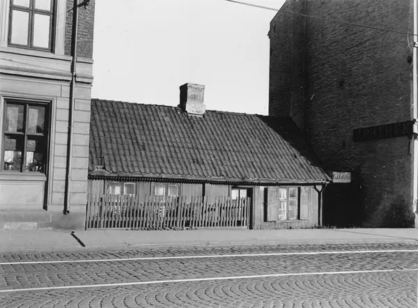 trehus, gjerde, bygårder, port, brenselsforretning, brostein, trikkeskinner