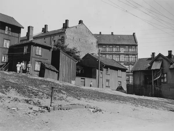gate, vannport, trehusbebyggelse, bygårder, mennesker