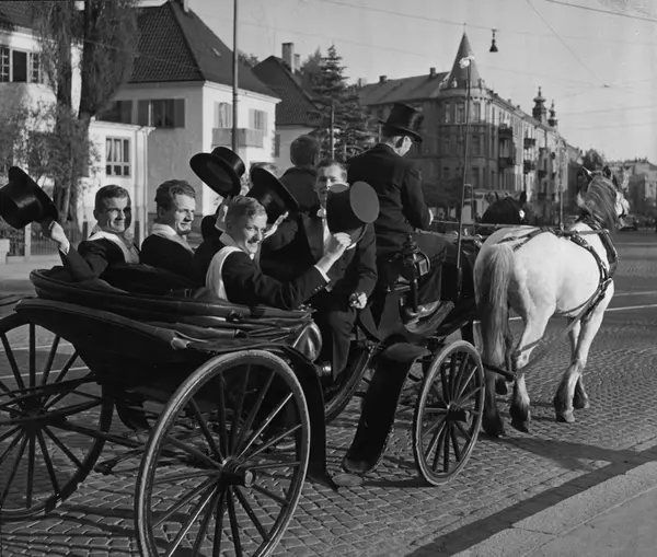 hestekjøretøy, menn, studenter, kusk, flosshatter, bygårder