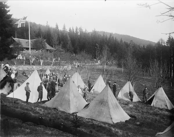 Rønningen pensjonat og kafé , hage, teltleir, gutter, speidere, restaurantbygning, flagg, mennesker