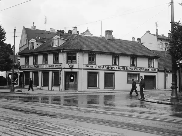 forretningsgård, Jens J. Andersen kjøtt, flesk og pølsevarer, menn, trikkeskinner, brostein