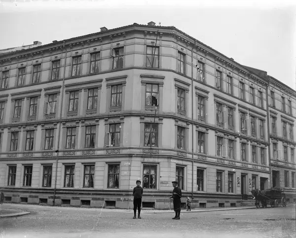 Fossveien 21 på hjørnet av Helgesens gate. Steenstrups gate 12 til høyre. O. Mørk kolonialforretning: O. står for Olivia.