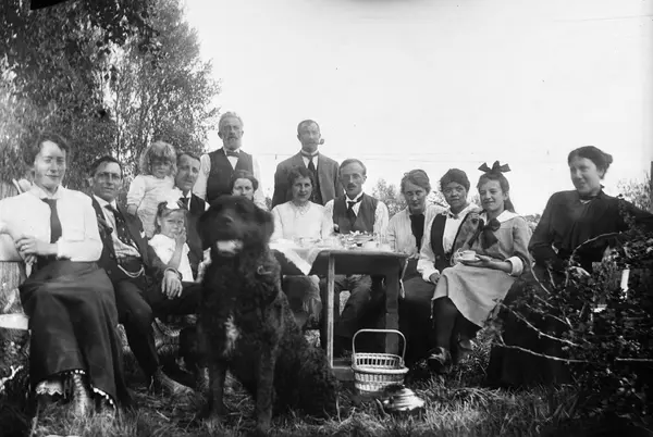 hage, gruppe, kvinner, menn, barn, kaffebord, kaffeselskap, hund
