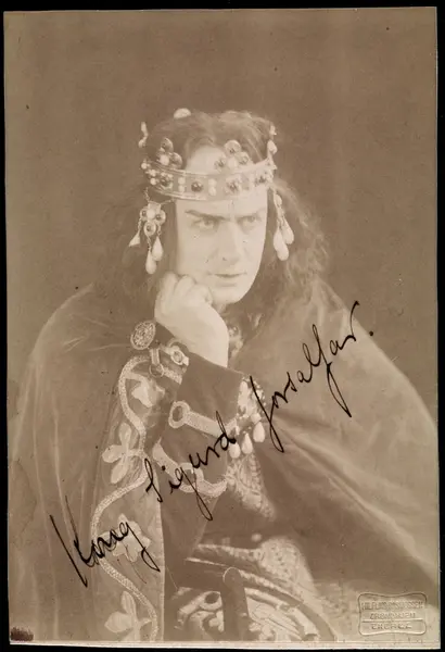 På baksiden: "Til minde om Trondhjems Nationale Scenes Aabningsforestilling 15-9-11. Alf Blütecher" Sigurd Jorsalfar var Trondhjems Nationale Scenes åpningsforestilling, basert på Bjørnstjerne Bjørnsons skuespill med samme tittel.