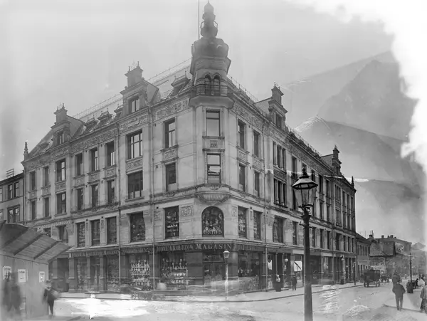 forretningsgård, hjørnegård, John F.A Køltzow Magasin, utstillingsvinduer, mennesker