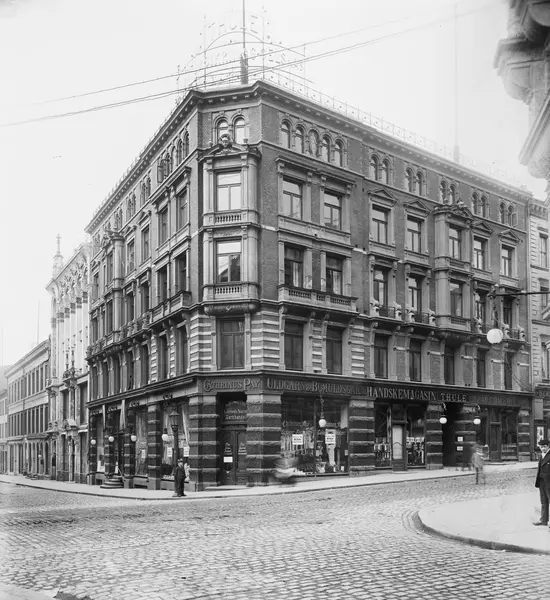 forretningsgård, hjørnegård, Cathrinus Pay lerretsvarer og garnhandel, reklame på taket: Thule Forsikringsselskab, mann, gutter