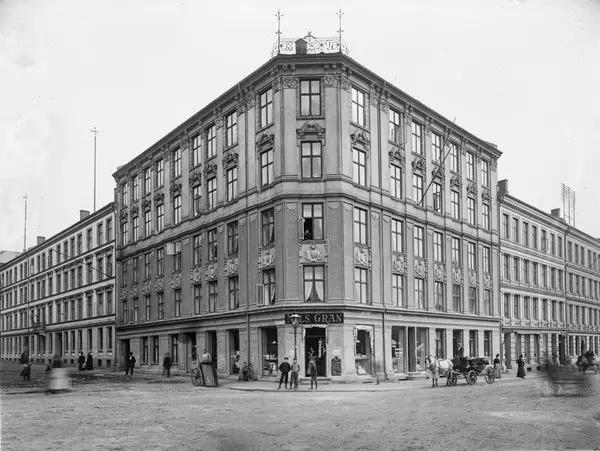 bygårder, hjørnegård, Nils Gran kolonialforretning, mennesker, hestekjøretøy, drakjerre