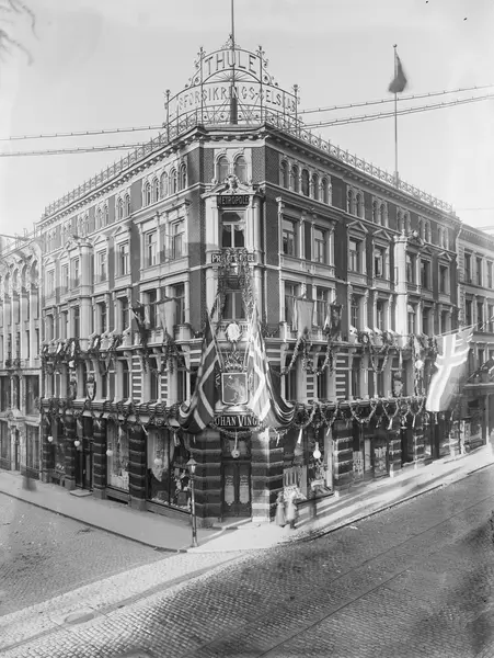 forretningsgård, hjørnegård, Metropole Hotel, Johan Vinge manufakturforretning, pyntet til kong Oscar IIs regjeringsjubileum, girlander, unionsflagg, reklame på taket: Thule Forsikringsselskab, mennesker