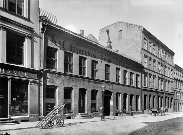 forretningsgårder, Alf Bjerckes fargehandel, vinforretning, utstillingsvinduer, menn, hestekjøretøy, håndkjerre, gatebelysning, jente