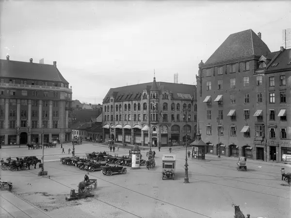utsikt, torg, mennesker, biler, Østensjø-buss, hestekjøretøyer, kiosk, forretningsgårder