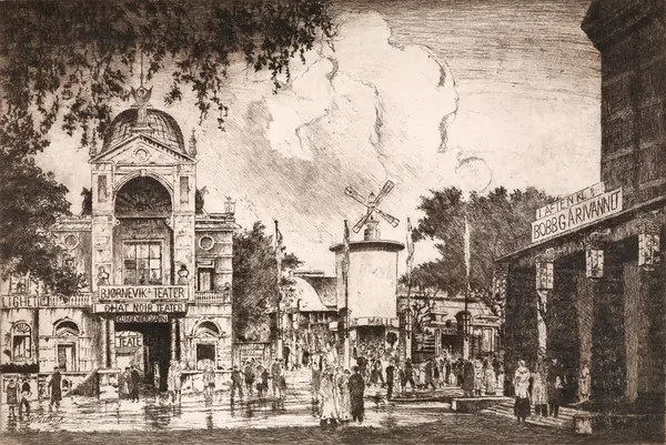 Byprospekt med Klingenberggaten og skilt for Bjørneviks Teater og Chat Noir Teater. Midt på bildet Røde Mølle. Til høyre Nationaltheatrets fasade med plakat for forestillingen "Bobb går i vannet".
