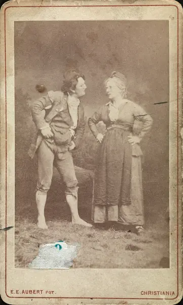scenebilde, mann, kvinne, skuespillere, rollebilde, Peer Gynt og Mor Aase på Christiania Theater, stående helfigur, kostymer