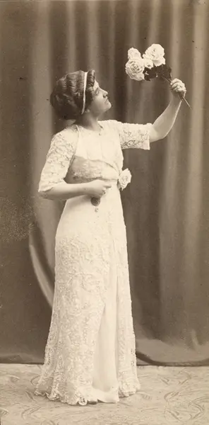 portrett, kvinne, skuespillerinne, rollebilde, Lady Windemere i "Lady Windemeres vifte" på Nationaltheatret, stående helfigur, kostyme, blomsterbukett i hånden