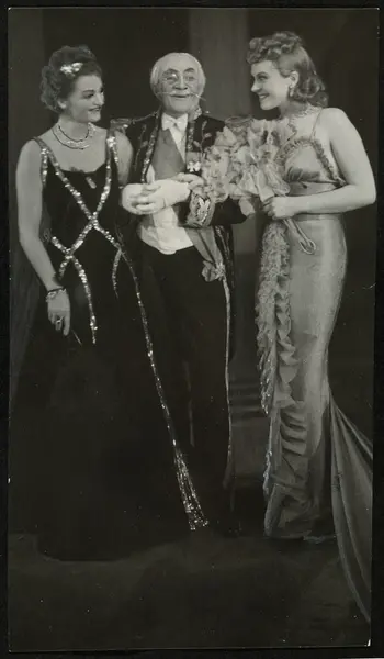 trippelportrett, kvinner, mann, sangerinne, skuespillere, rollebilde, "Grevinne Maritza" på Nationaltheatret, stående helfigur, kostymer