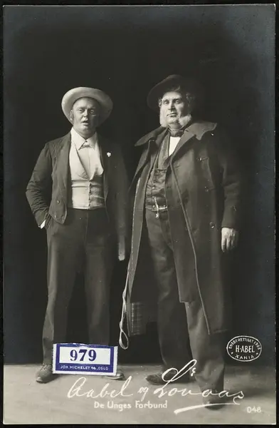 dobbeltportrett, mann, skuespiller, rollebilde, Bastian Monsen og hans far Proprietær Monsen i "De unges forbund" på Nationaltheatret, stående helfigur, kostyme