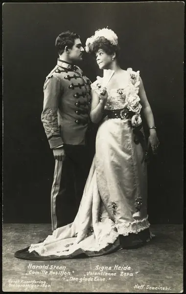 dobbeltportrett, mann, kvinne, skuespillere, rollebilde, Camille Rosillon og Valencienne Zeta i "Den glade enke" på Centralteatret, stående helfigur, kostymer