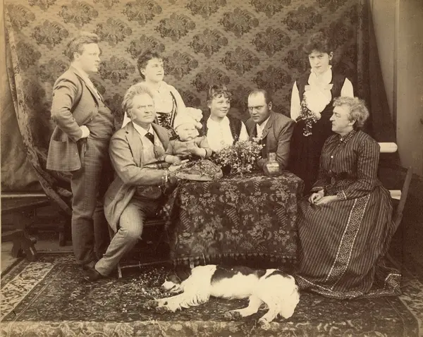 Fra venstre: Bjørn Bjørnson, Bjørnstjerne Bjørnson, Bjørnstjerne Erlingsen Bjørnson, Bergliot Ibsen (f. Bjørnson), Anna Mæhlum (g. Bjørnson), Erling Bjørnson, Dagny Bjørnson Langen, Karoline Bjørnson.