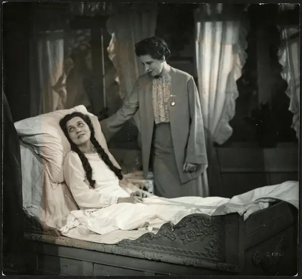 dobbeltportrett, kvinner, skuespillerinner, rollebilde, Klara Sang og Hanna Roberts i "Over Ævne" på Nationaltheatret, stående og sengeliggende halvfigur, kostymer