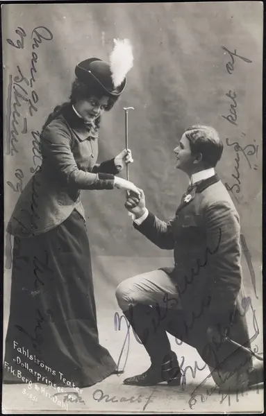 dobbeltportrett, mann, kvinne, operettesangere, rollebilde, Daisy Gray og Hans - friherre von Schlick i "Dollarprinsessen", stående og knelende helfigur, kostymer