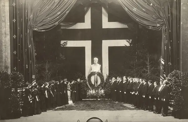 Nationaltheatret, interiør, scene, minneforestilling ved Bjørnstjerne Bjørnsons død, portrettbyste, laurbærkrans, flagg, kvinner, menn, skuespillere