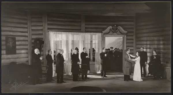 Olafr Havrevold ved døren, Johanne Dybwad i hvit kjole, Tore Segelcke helt til høyre.